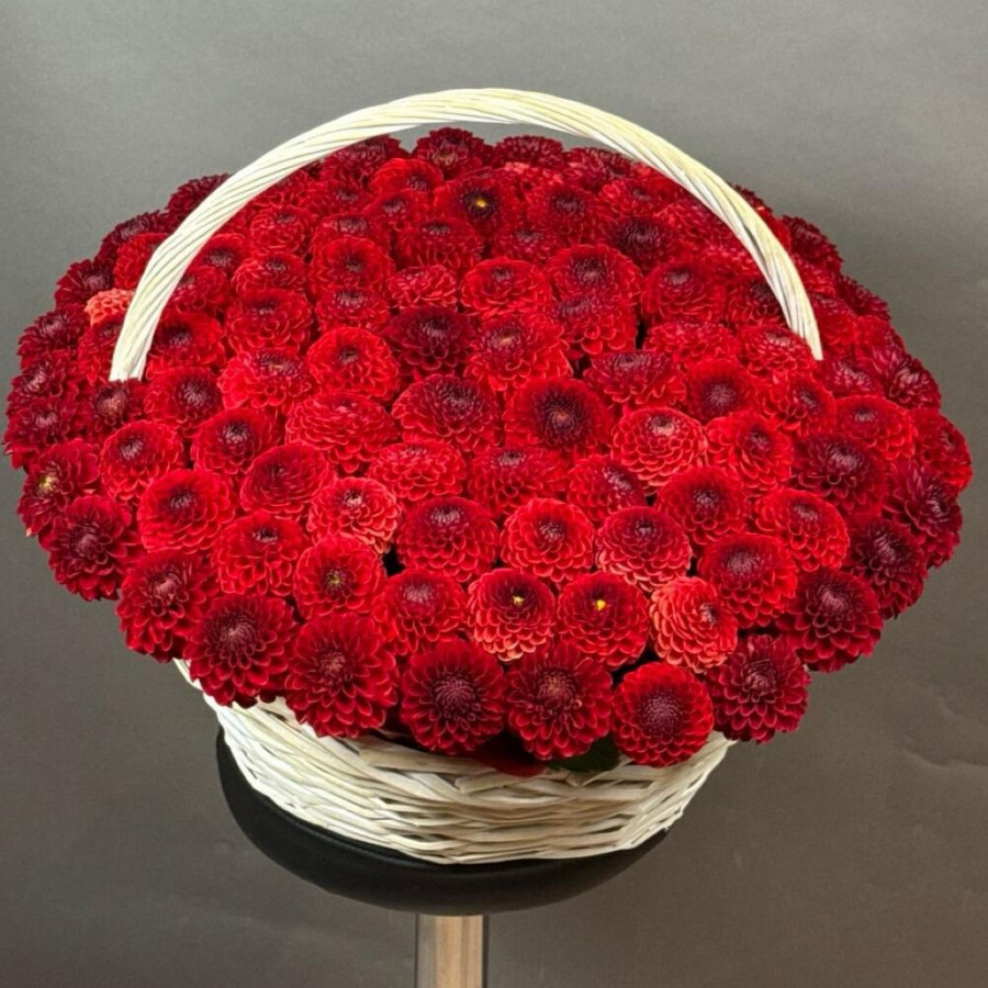 Композиция из 101 красной георгины в корзине в Октябрьском