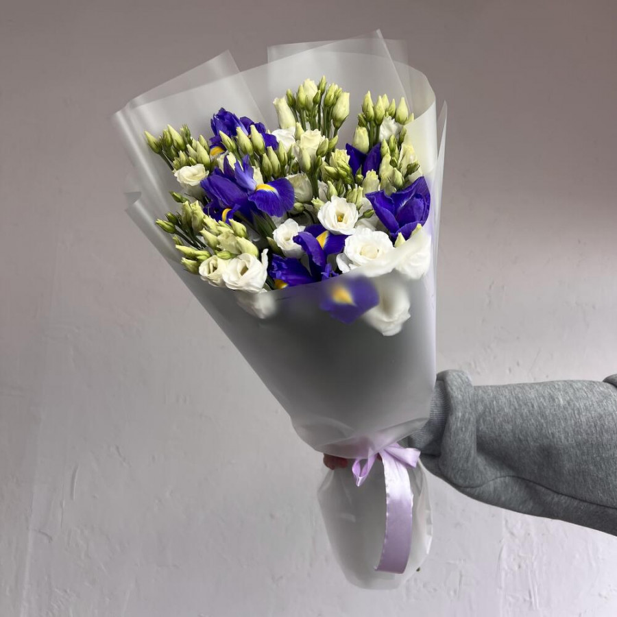 На фото букет из синих ирисов и белой эустомы. В составе: ирис 5 шт, эустома (лизиантус) 6 шт, дизайнерская упаковка 1 шт, атласная лента 1 шт, . Все цветы свежие и ароматные, букет красиво оформлен и отлично подходит для подарка. Доступна доставка цветов или самовывоз.
